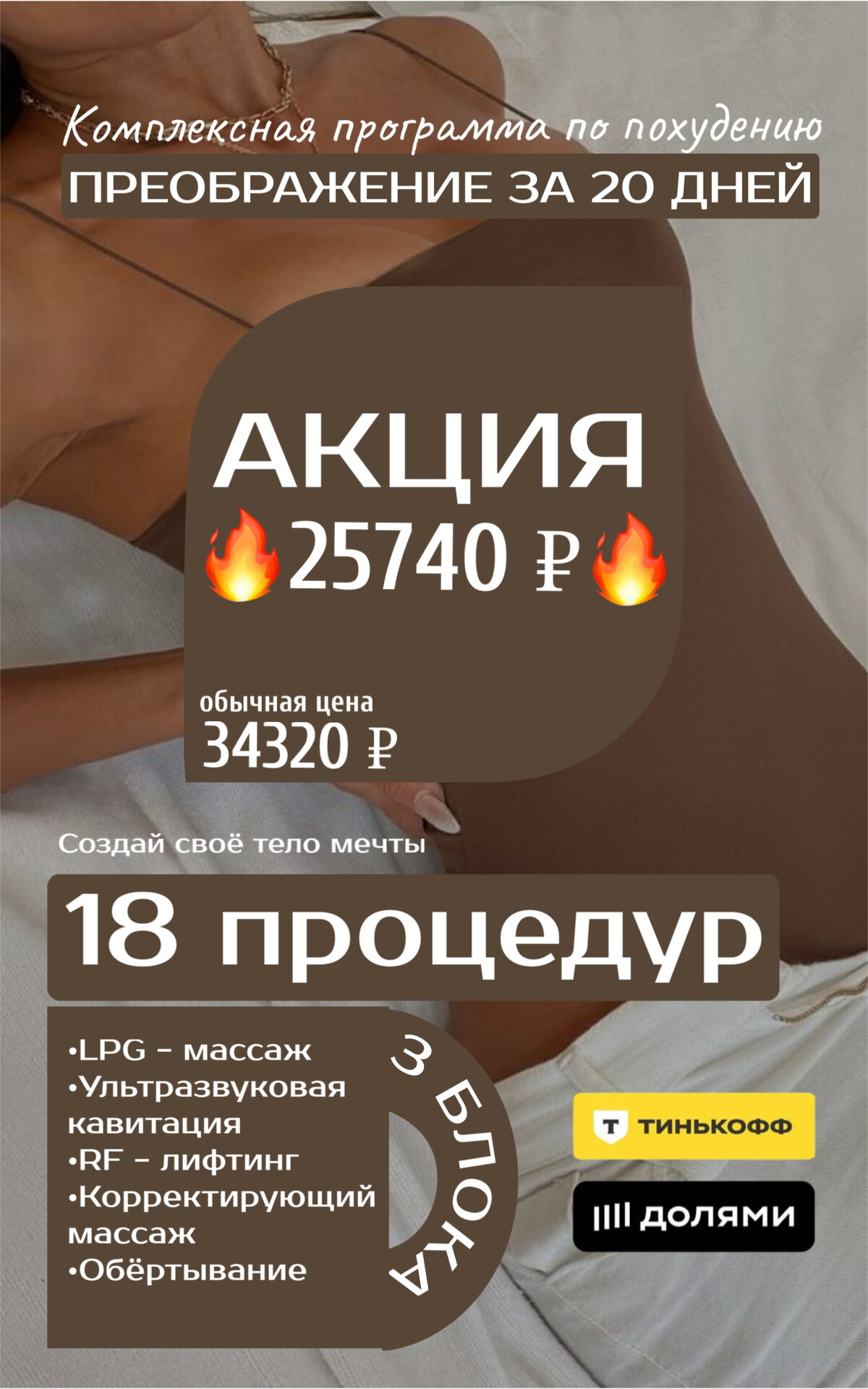 Аппаратный массаж тела: LPG, компрессионная терапия, rf лифтинг, ультразвуковая кавитация, вакуумный массаж тела в сочетании с rf лифтингом, микротоки.
